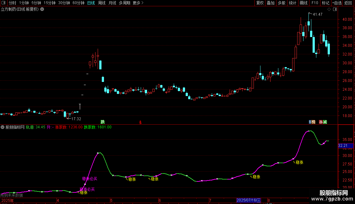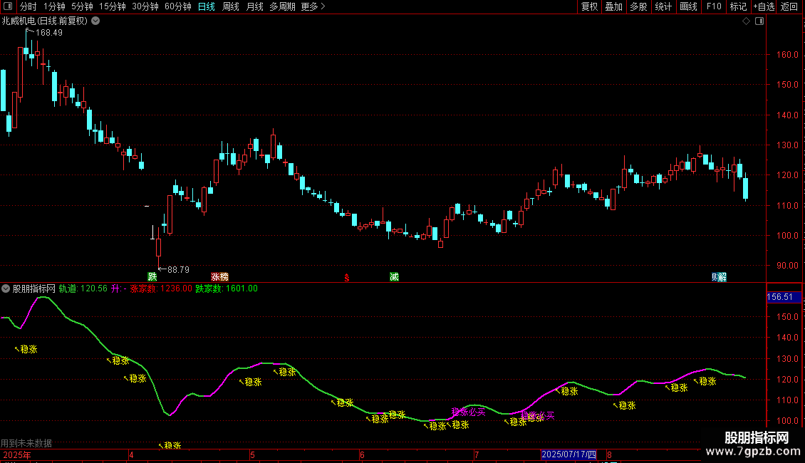 指标包含三条轨道线(红轨道、轨道、升),用于判断趋势方向。起爆信号基于MACD差值变化,当差值加速上穿15时提示“稳涨”。稳涨必买信号结合30日RSI快速上升(>9)和放量条件(>2.4倍或连续缩量后放量)。副图还显示涨跌家数及涨停标记。选股预警可直接用于条件选股或盘中预警。