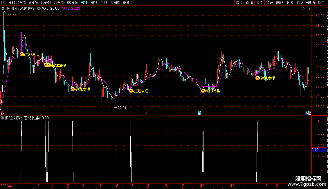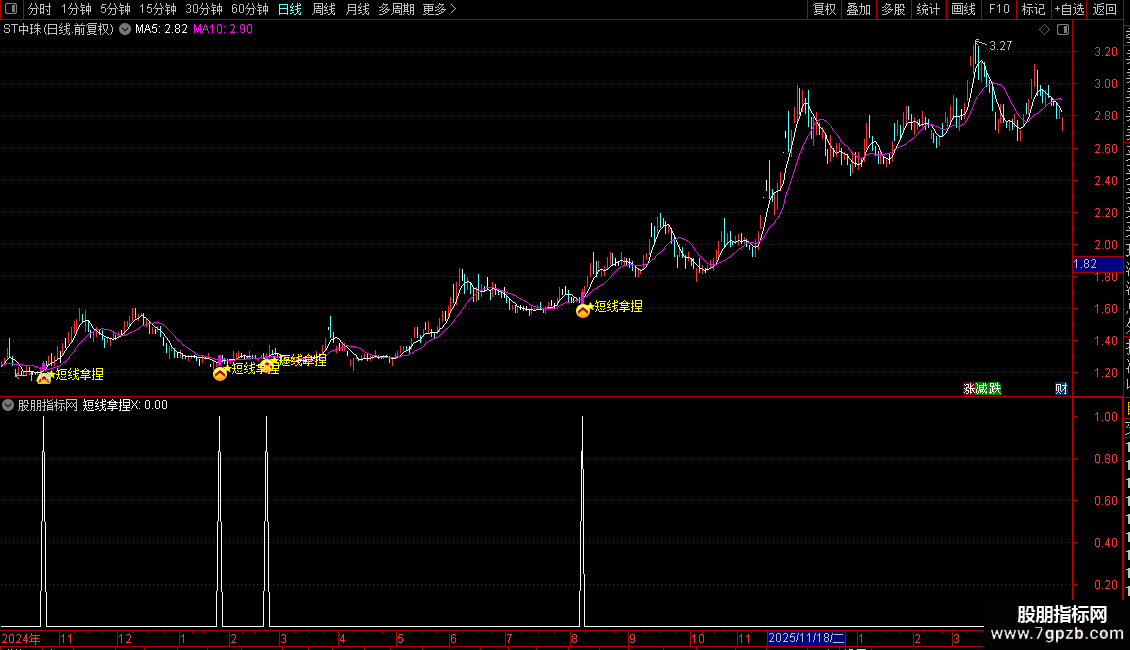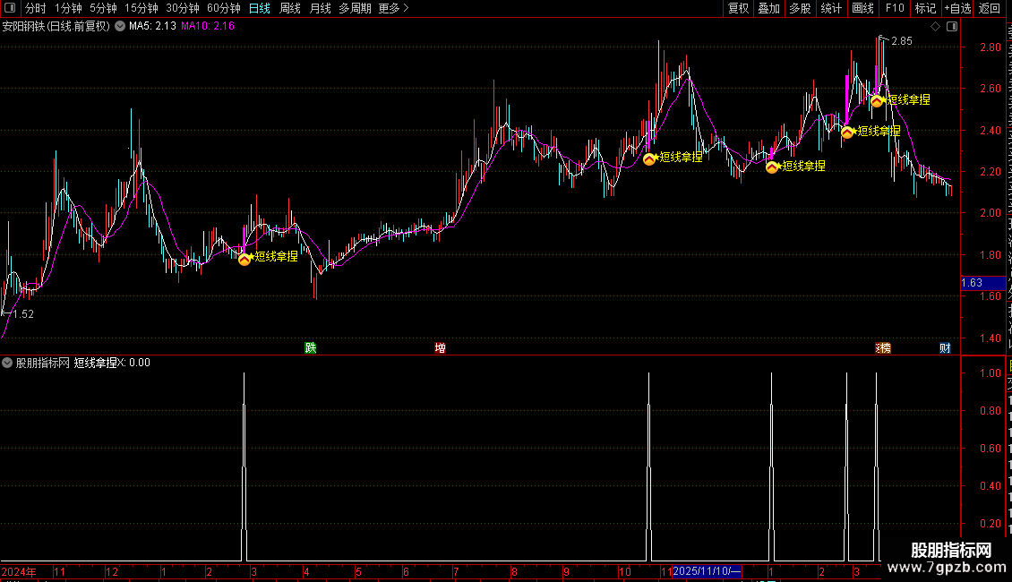 1. 主图指标:导入通达信后加载,出现粉色信号柱+黄色★图标+文字提示,即为短线介入信号;