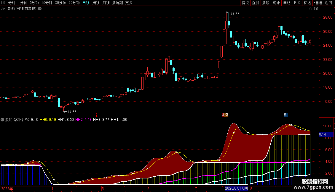 - 通过LLV函数提取M5的多个低点层级(H1-H4),形成带状支撑区。