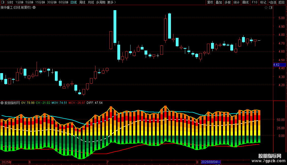 当满足条件GV>开盘价时,在0和GV*0.8位置之间画柱状线,宽度为2,0不为0则画空心柱.,COLOR0000FF