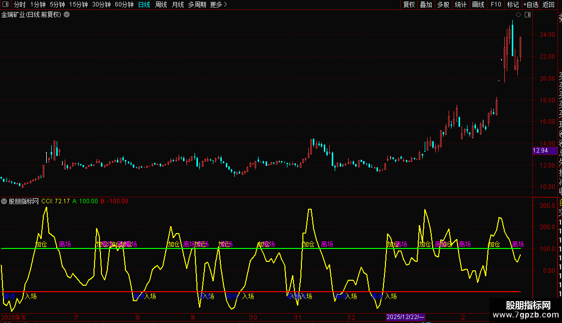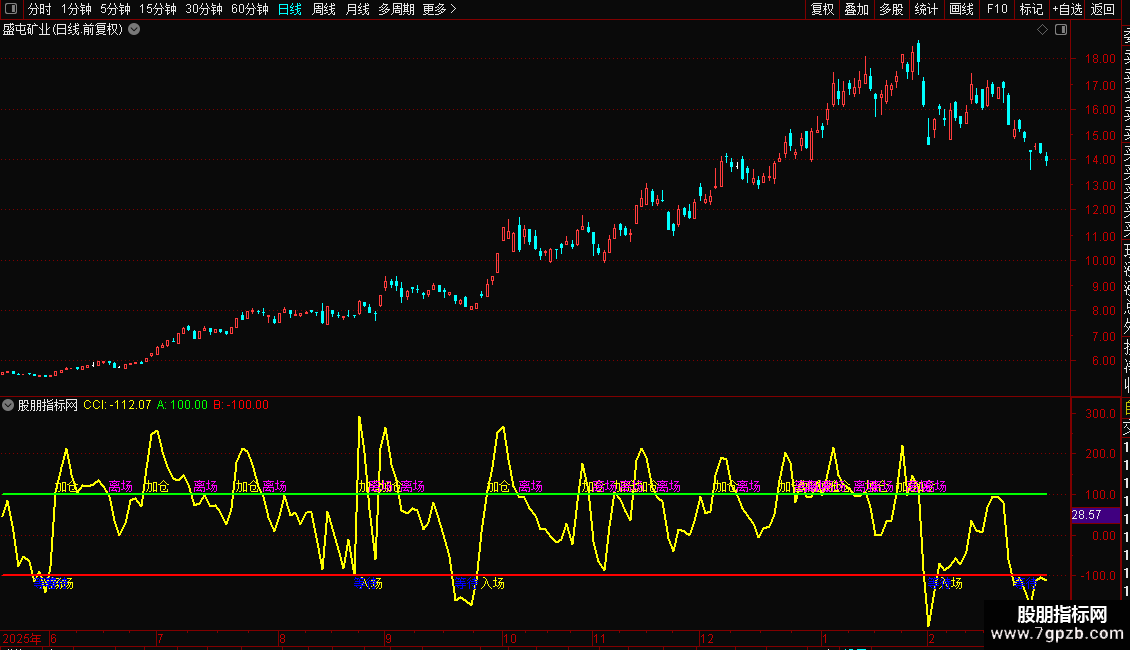 指标用法:100以上超卖区,超卖区关注进场、离场信号,结合指标背离判断高点,-100以下超买区,超买区关注等待、进场信号,最好-100以下上穿效果最佳。