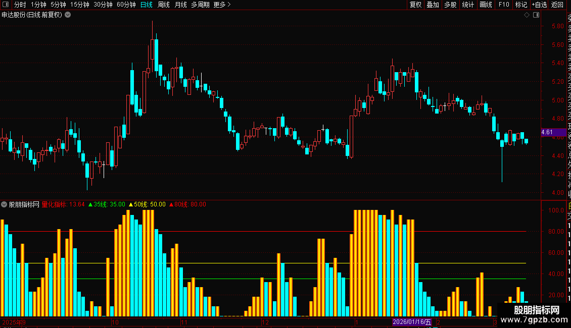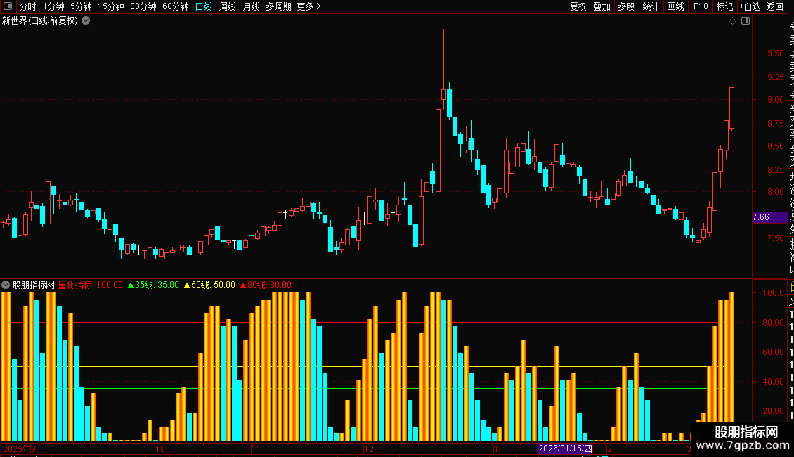 STICKLINE(量化指标>=REF(量化指标,1),0,量化指标,0.6,0),COLOR00C0FF;