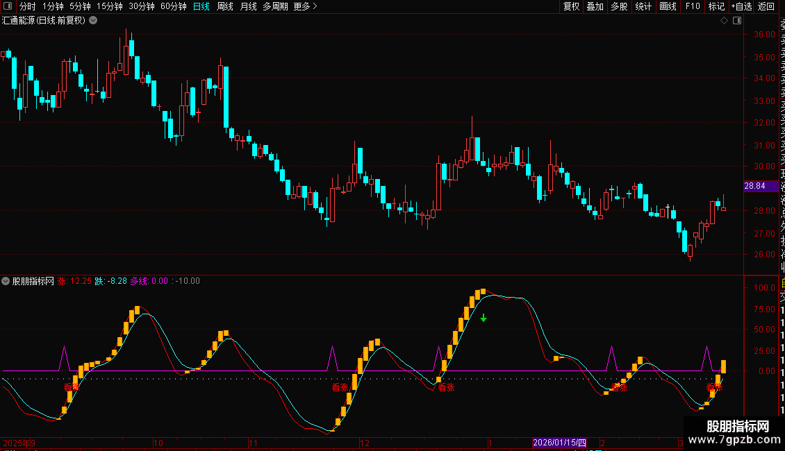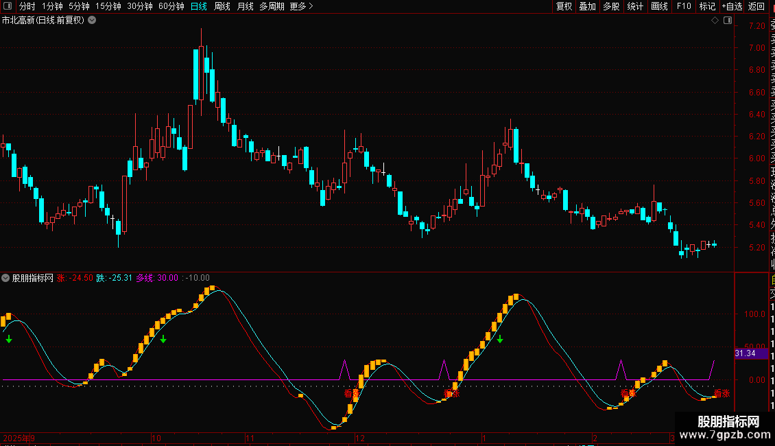 多线:IF(CROSS(涨,跌) AND 跌<-10,30,0),LINETHICK1,COLORFF00FF;