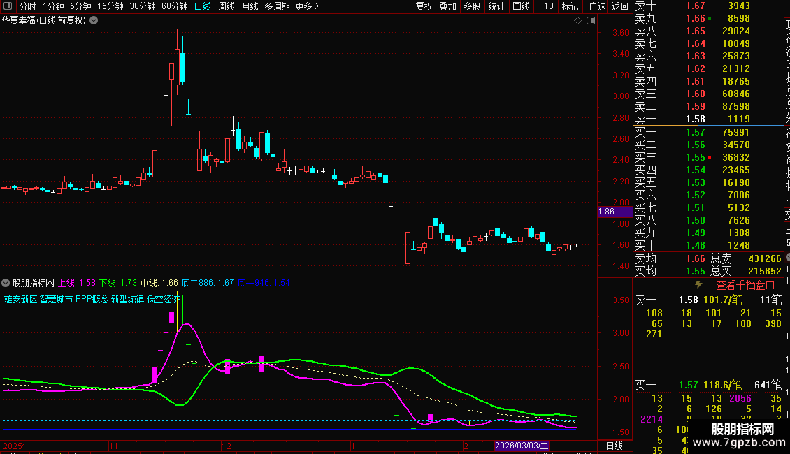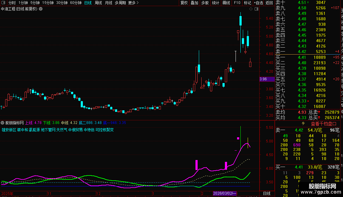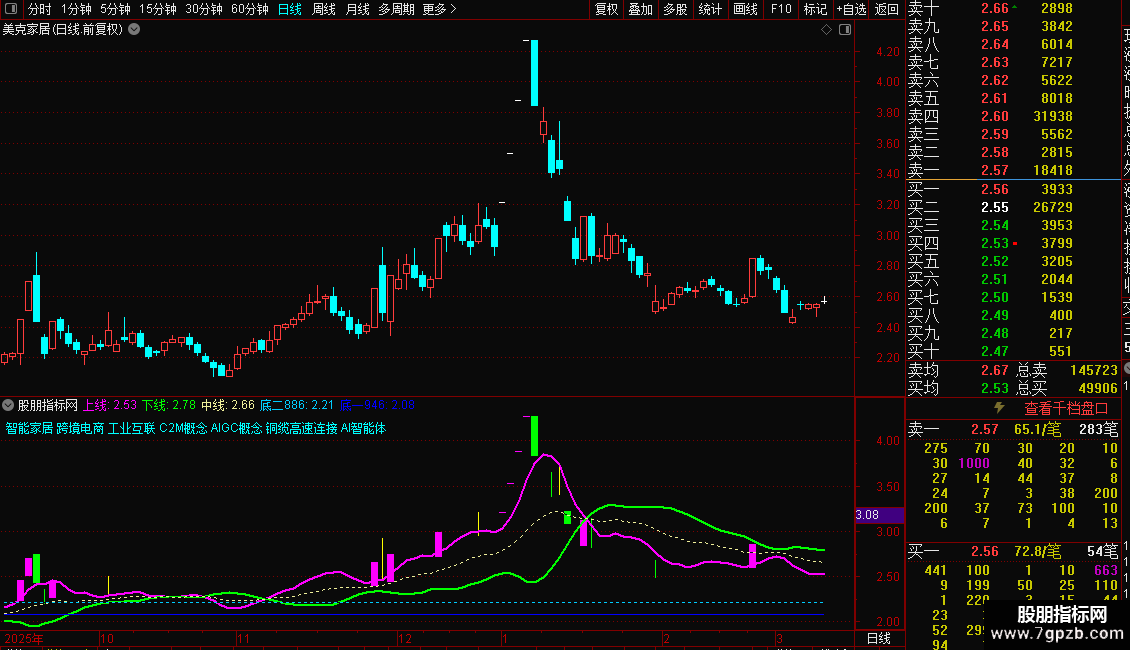 使用方法:紫色上线 上穿白线和绿线,为买入机会。辅助当下热点题材,收益不错。同时,K线亮色显示涨停和跌停,注册制20%也适用。