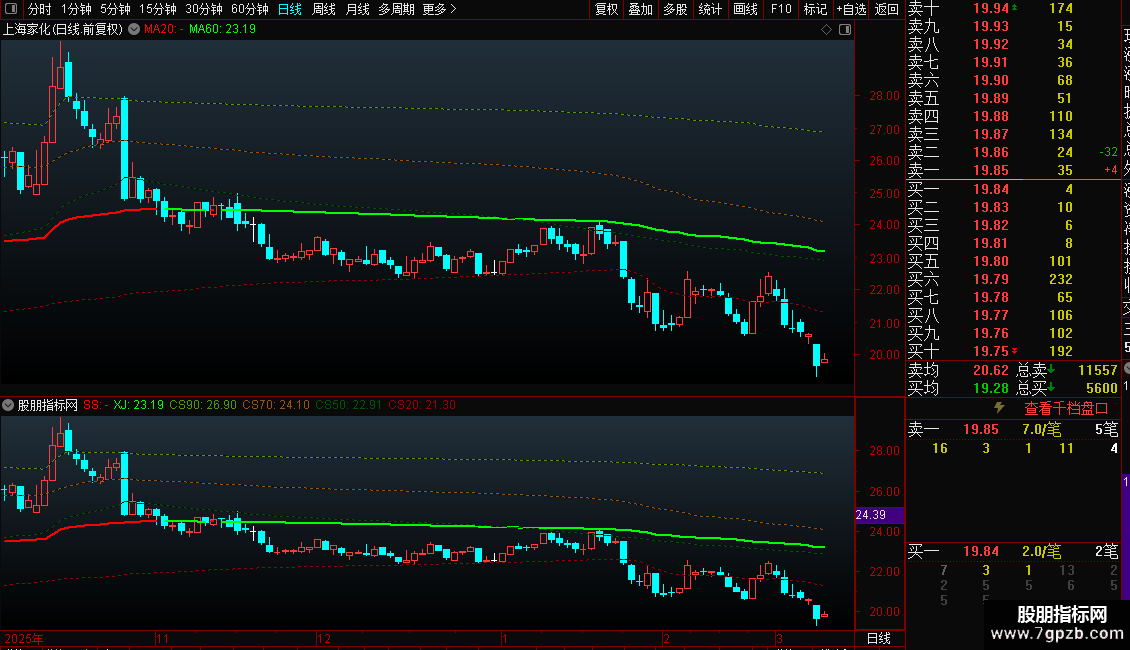 此主图由一根趋势线加四条定位线组成,红色粗线是上升趋势,绿色是下降趋势,可以看到比较强的支撑与压力,虚线是筹码成本线,可以看出筹码走向。如果需要看比较久的K线,需要设置不复权才会准确。
