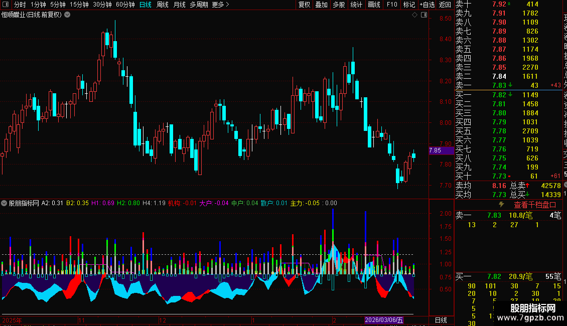 当满足条件机构<0时,在H2和H2+2*(散户的绝对值+中户的绝对值+大户的绝对值+机构的绝对值)位置之间画柱状线,宽度为1,0不为0则画空心柱.,画蓝色