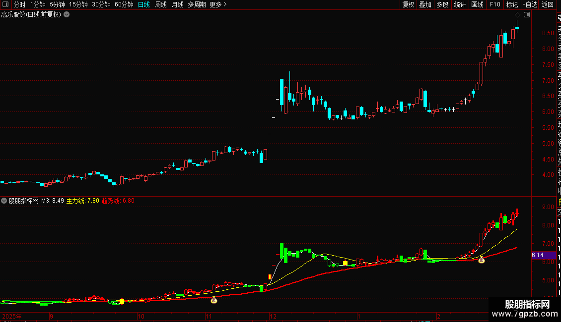 金叉共振:=IF(CROSS(周DIF,周DEA)*BA,MACD+0.1,0)*X3,COLORWHITE,LINETHICK2;