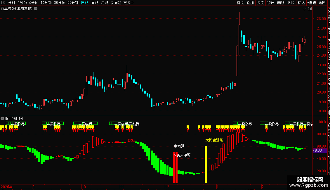 DRAWTEXT(VAR11X AND COUNT(VAR11X,30)=1,70,'大资金进场'),LINETHICK1,COLORYELLOW;