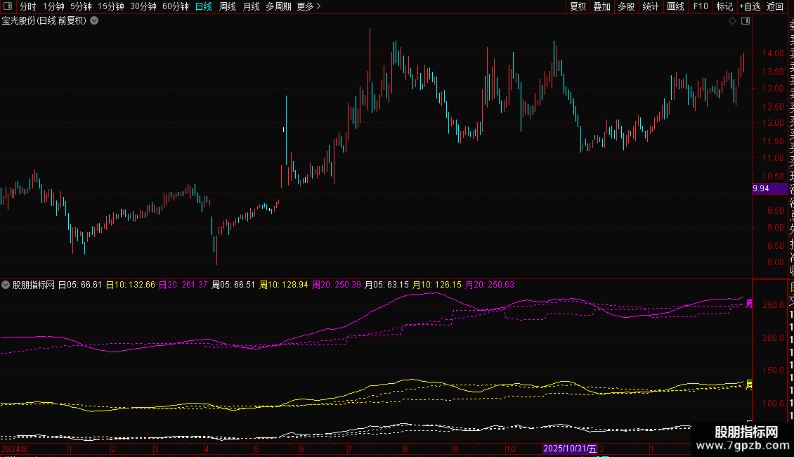 本指标为主图,设置了5、10、20三种均线,白线为5(日周月),黄线为10(日周月),洋红线为20(日周月),都帮大家在后面用文字标记出来。
