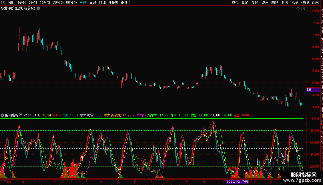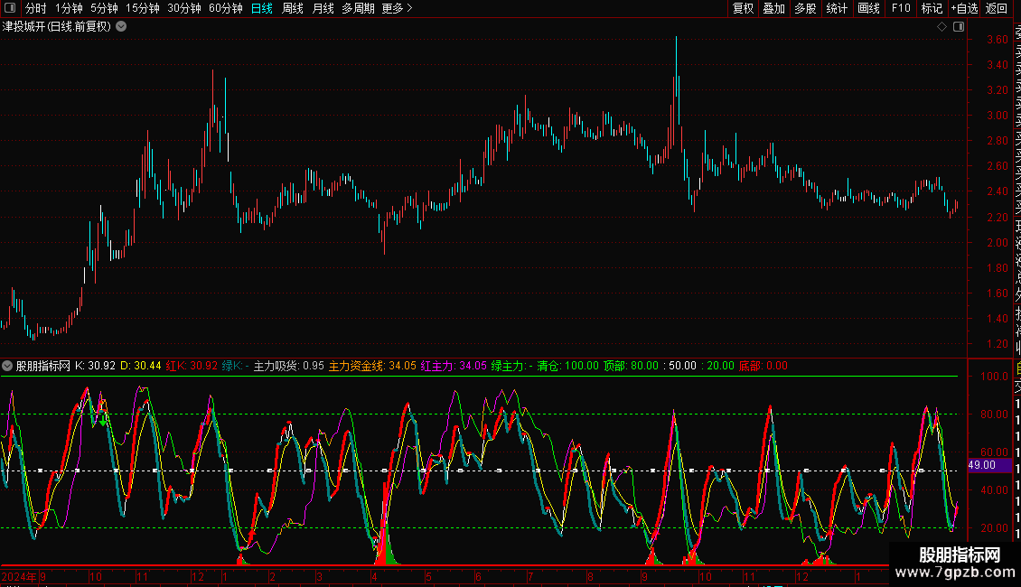 内有主力资金线,20以下低位,80以上拐头快跑。