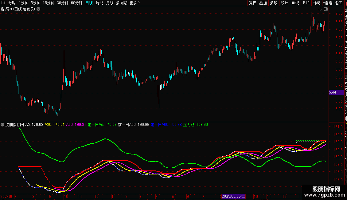 3,当A5上穿压力线时,为第一起涨点,当A5上穿所有均线时,就打下了大行情的基础;