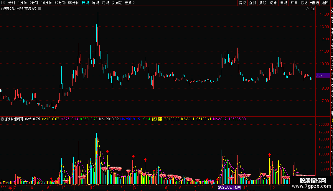 DRAWICON((MA(V,4)*4+V)/5>=MA(V,60) AND MA(V,5)<MA(V,60),预测量*1.2,1);