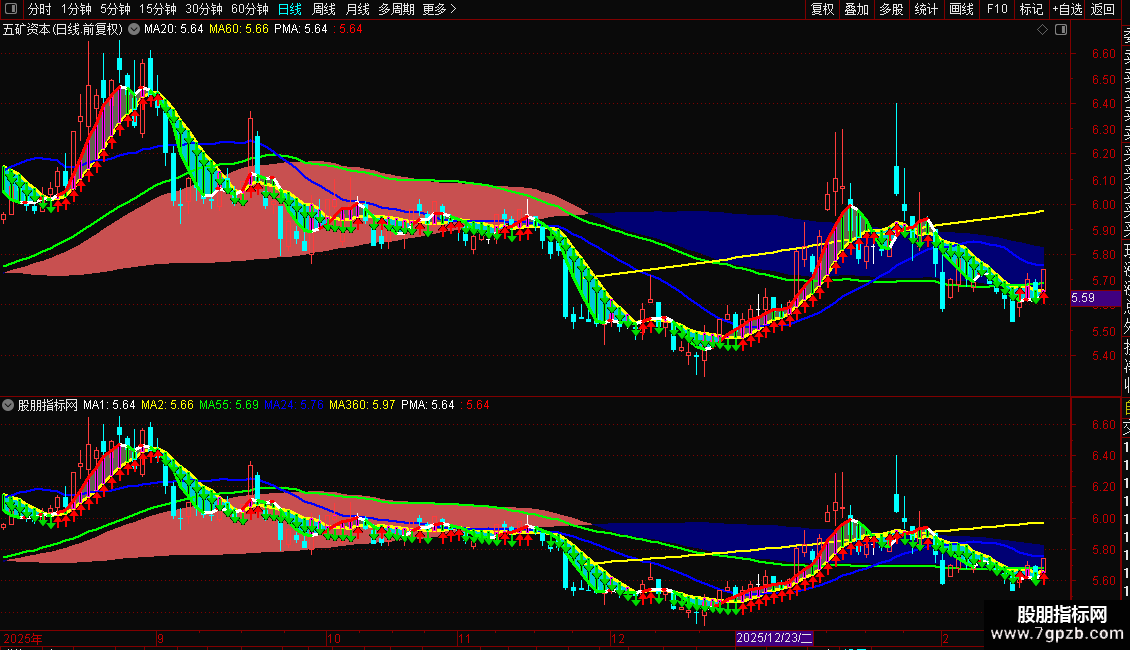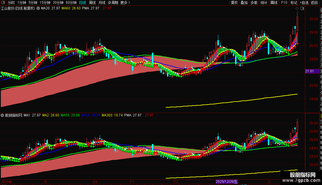 DRAWBAND(MA(CLOSE,N1),RGB(100,100,80),MA(CLOSE,N2),RGB(0,200,215));