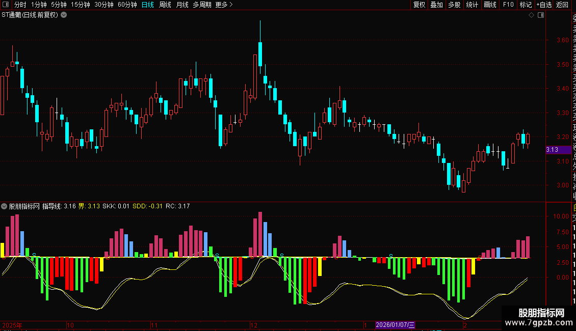 STICKLINE(DK<0 AND 多方<空方 AND SK<SD,RC,RC+DK,1,0),COLOR33FF33;