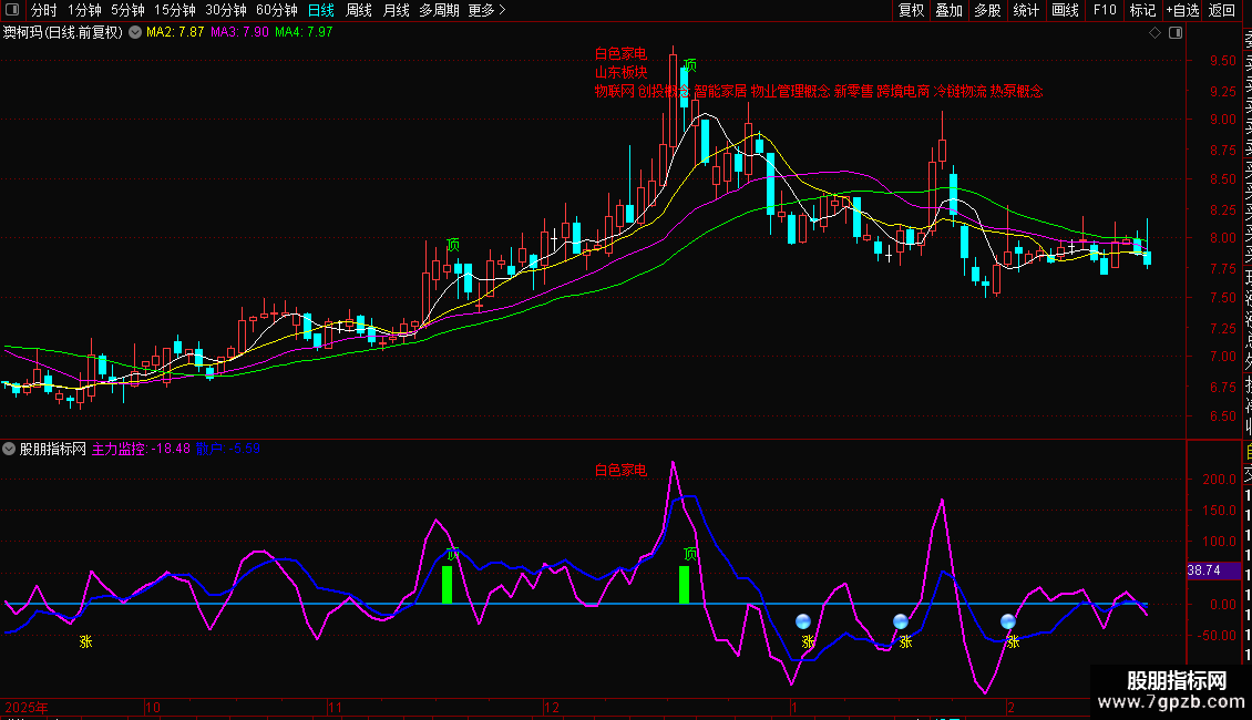 散户:=EMA( (CLOSE-MA(CLOSE,11))/MA(CLOSE,11)*480,7)*5,COLORBLUE ,LINETHICK2;