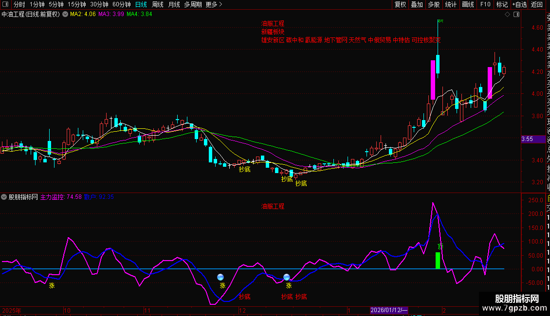 主力监控:EMA( (CLOSE-MA(CLOSE,7))/MA(CLOSE,7)*480,2)*5,COLORMAGENTA,LINETHICK2;