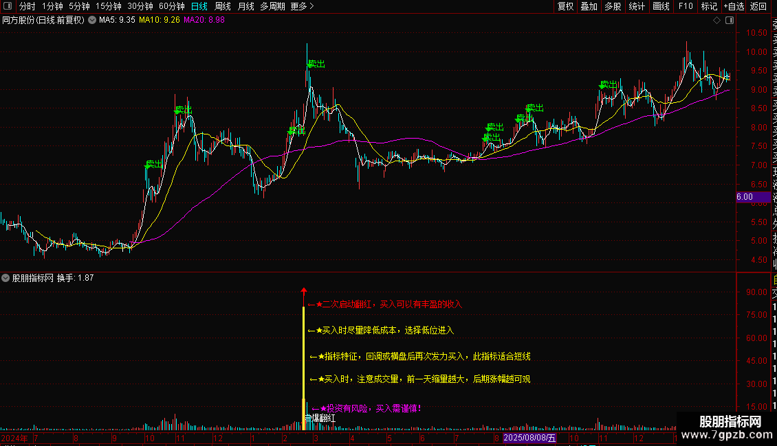 DRAWTEXT(XG1,48,' ←★指标特征,回调或横盘后再次发力买入,此指标适合短线'),COLOR00FFFF;