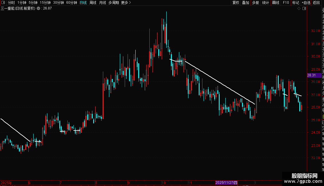 DRAWLINE(C>=趋势线,趋势线,C<趋势线,趋势线,0),COLORWHITE,LINETHICK2;