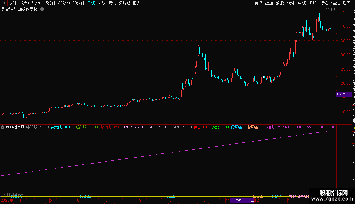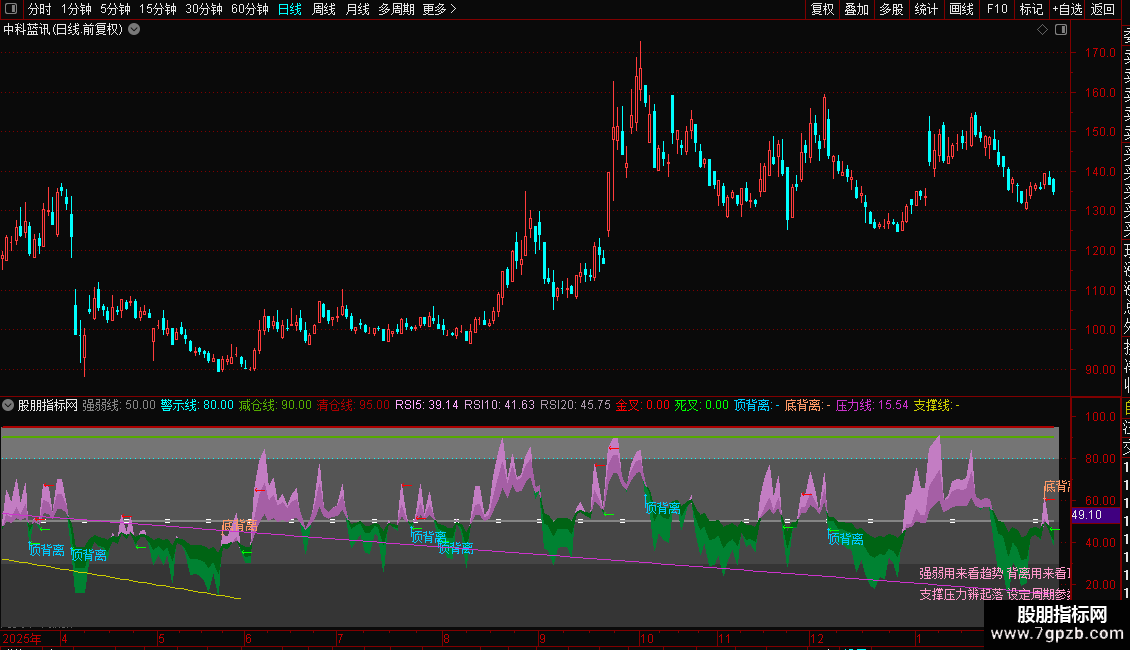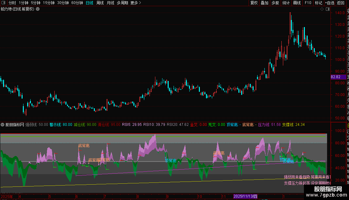 DRAWTEXT(CURRBARSCOUNT=30,25,'强弱用来看趋势 背离用来看顶底'),COLORCC99FF;