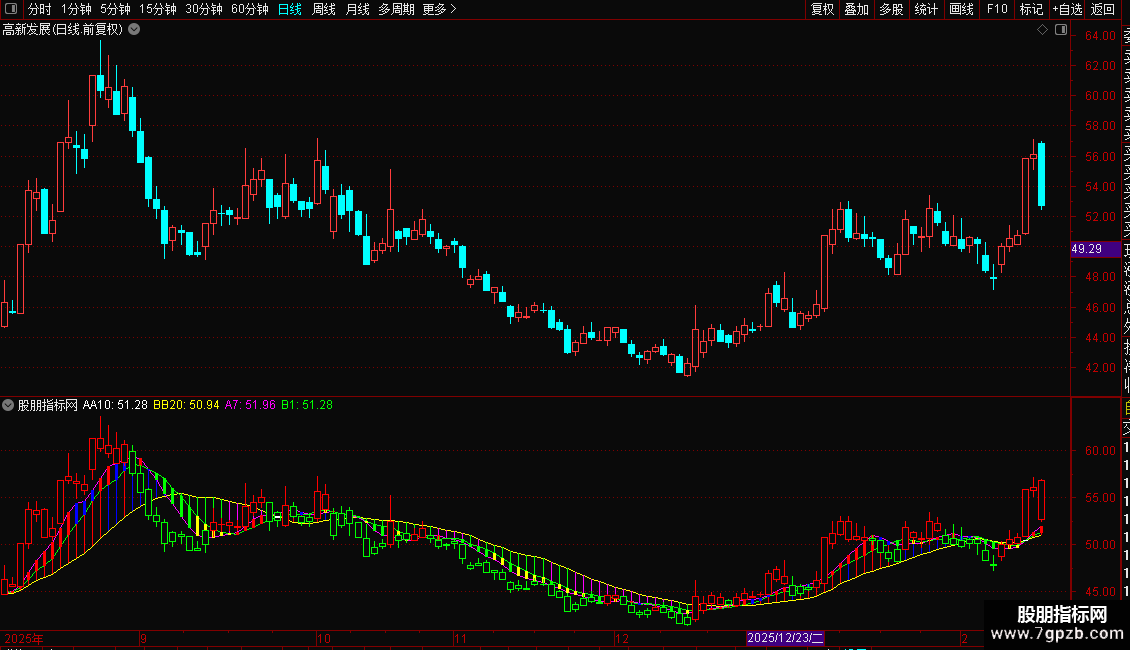 3.股价站在30周均线上处于多头位置,量线呈现三线开花的态势;