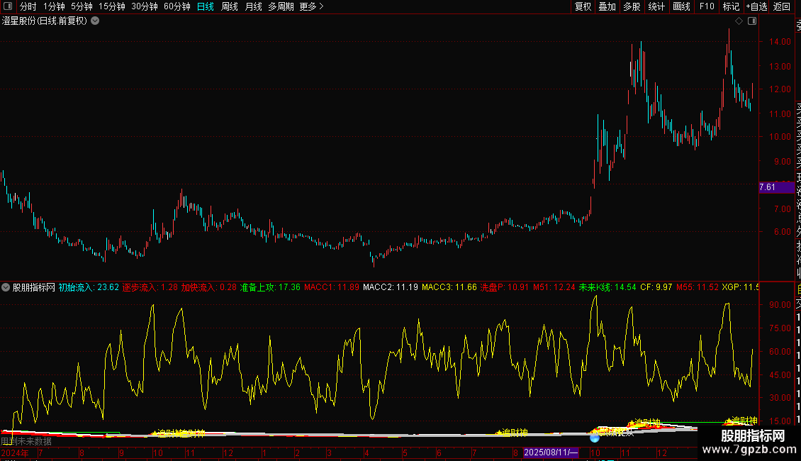 分水岭R:=IF(MA(CLOSE,13)<BR,BR,MA(CLOSE,13)),COLORFF00FF,NODRAW;