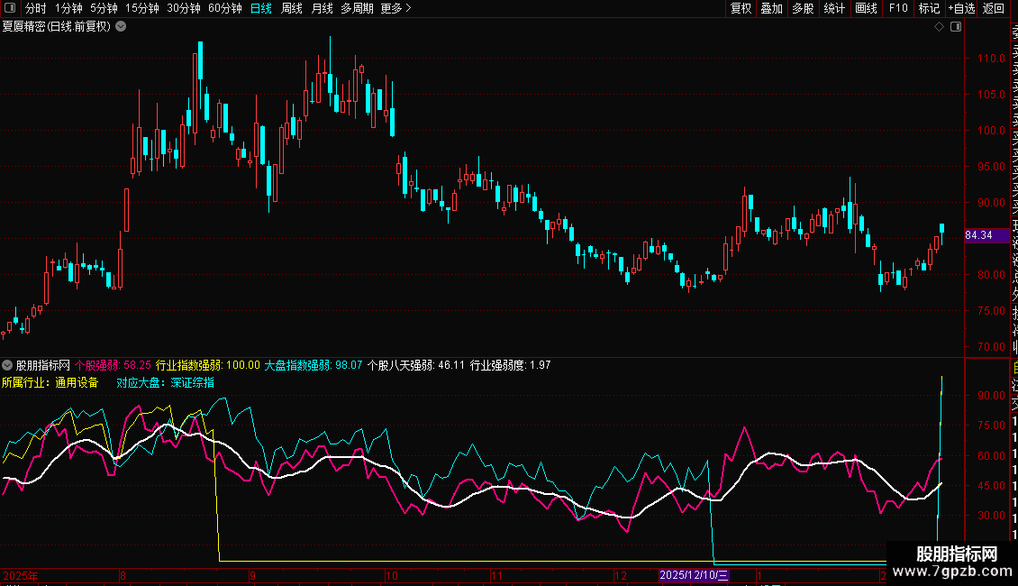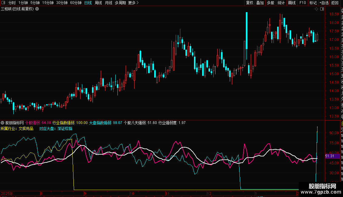 在一个副图中同时显示大盘(青色)、行业(黄色)、个股(洋红)、以及个股均线(白色)四条线。便于日常观察个股走势的强弱。