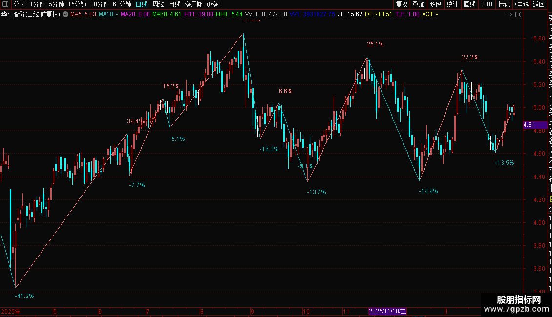 LH:DRAWLINE(L=LLV(L,周期),L,H=HHV(H,周期),H,0),COLORLIRED;