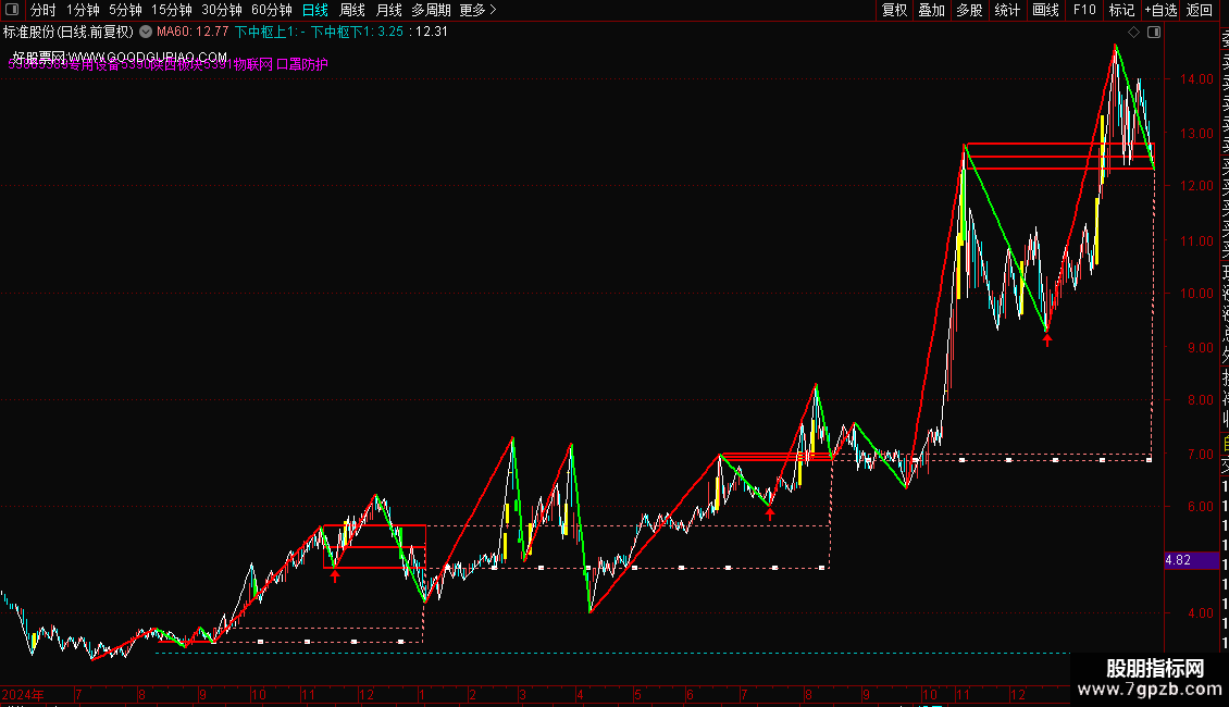 上中枢上1:IF(X_192>0,X_123,REF(X_123,BARSLAST(X_192>0))),DOTLINE,COLORLIRED;