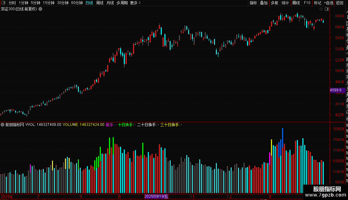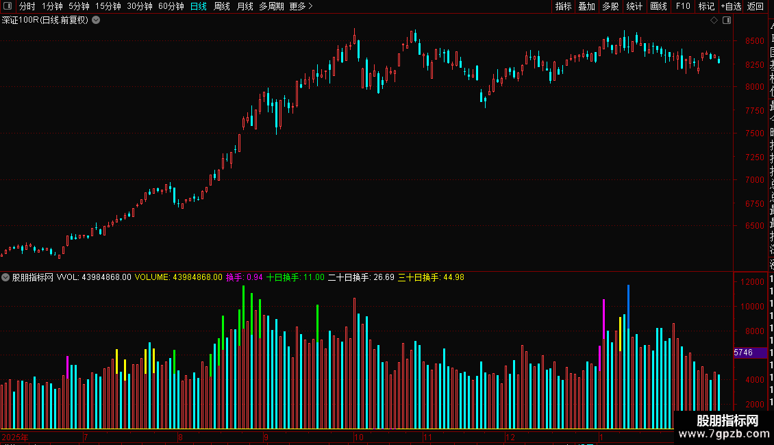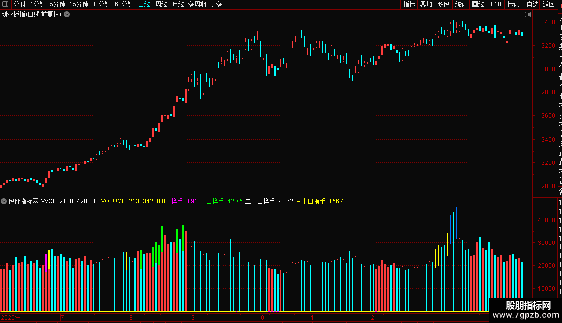 量柱下方,粉红色是三十日地量,黄色是六十日地量,绿色是一百天地量,蓝色是一年地量}