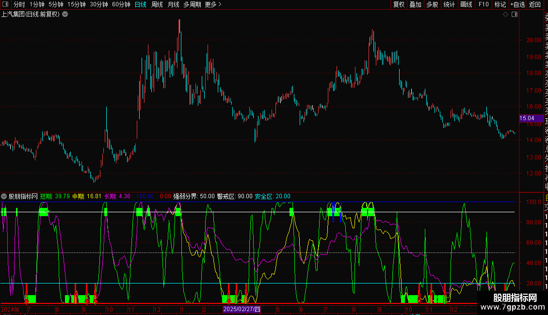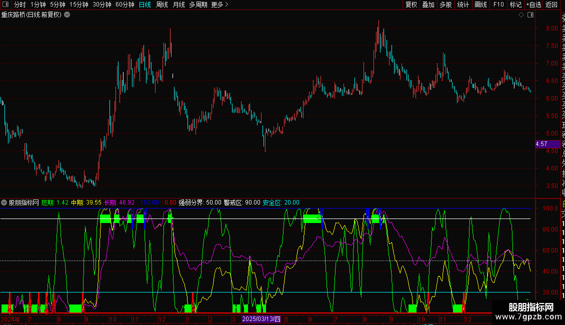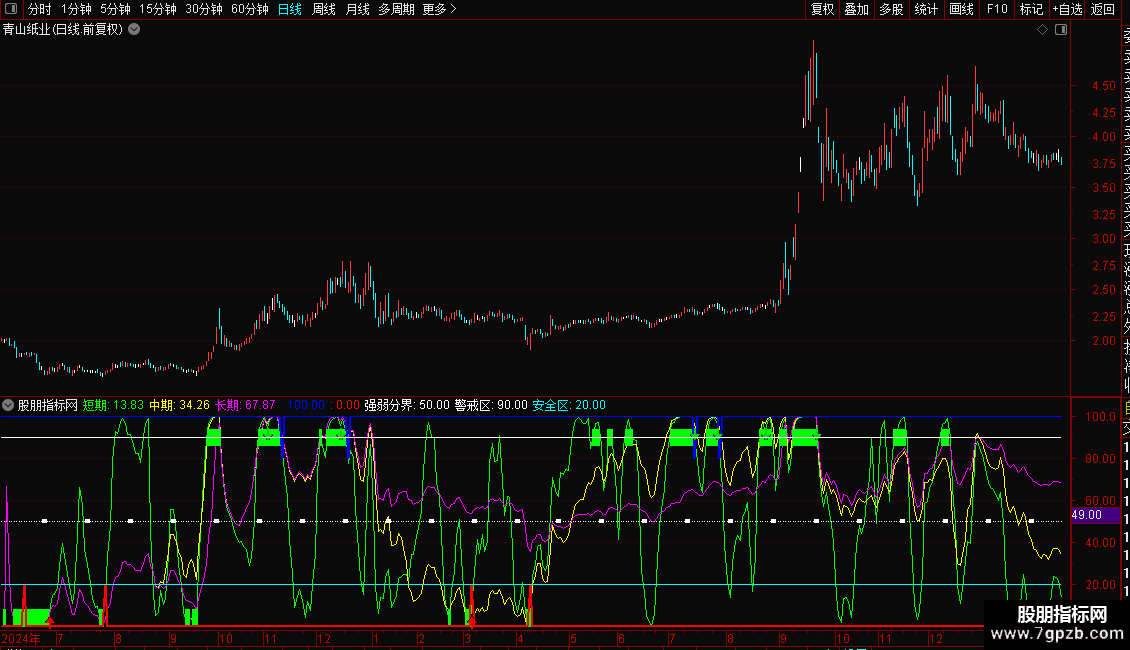 STICKLINE(短期>90 AND 中期>70,86,94,1,0),COLOR00FF00;