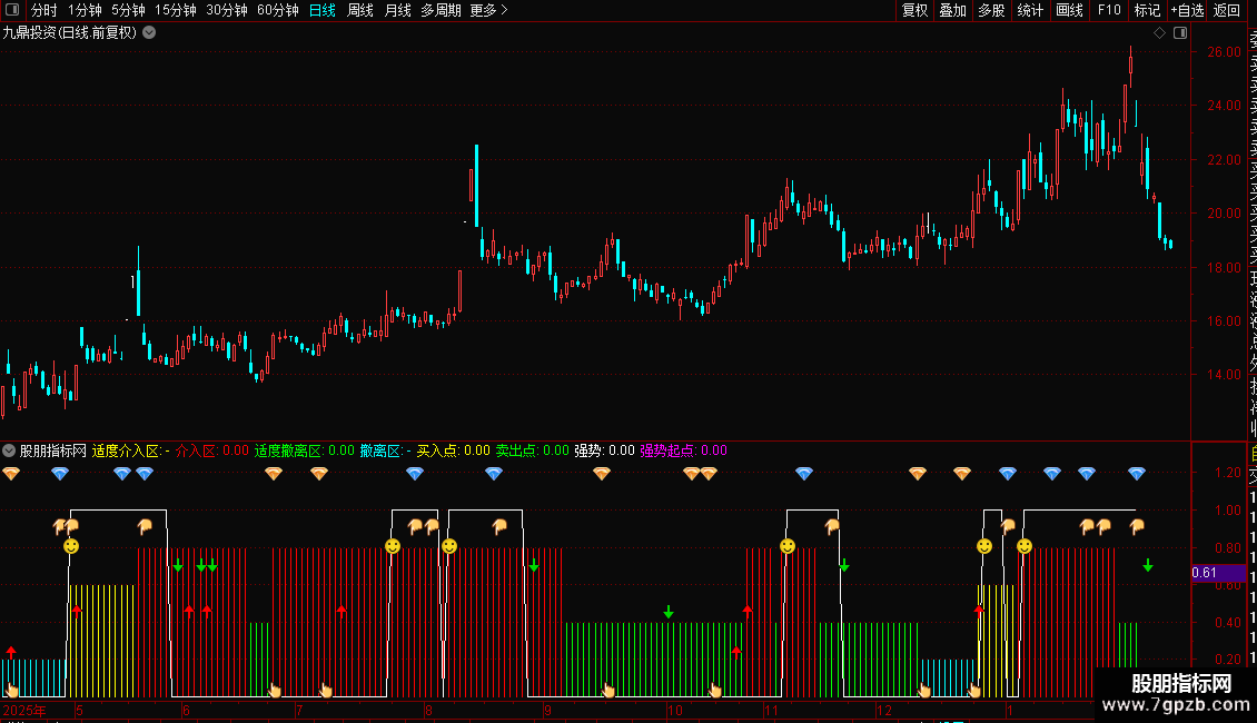 5.卖出信号:在个股强弱上行阶段,如涨势、涨幅先后下拐,会出现下指卖出信号。如涨幅下穿个股强弱或0轴,会分别出现高位或低位绿箭卖出信号。
