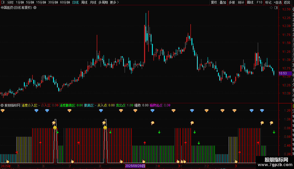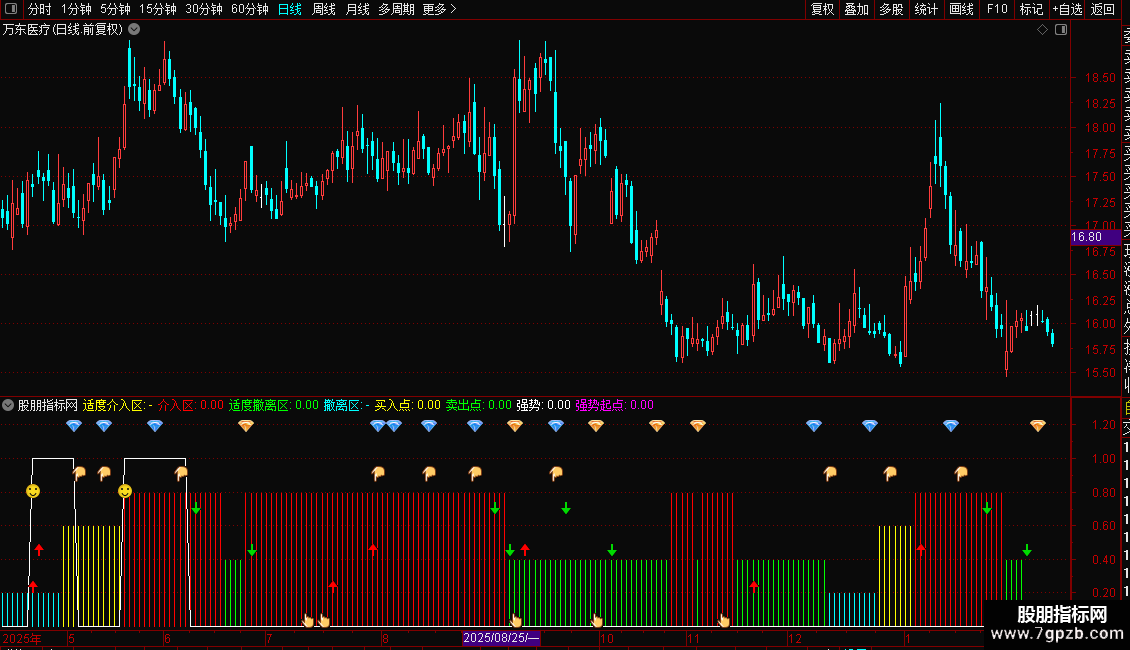 此指标根据大盘强弱走势标示“适度介入区”、“介入区”、“适度撤离区”和“撤离区”,根据个股强弱走势标示“留意”、“买入”和“卖出”点。