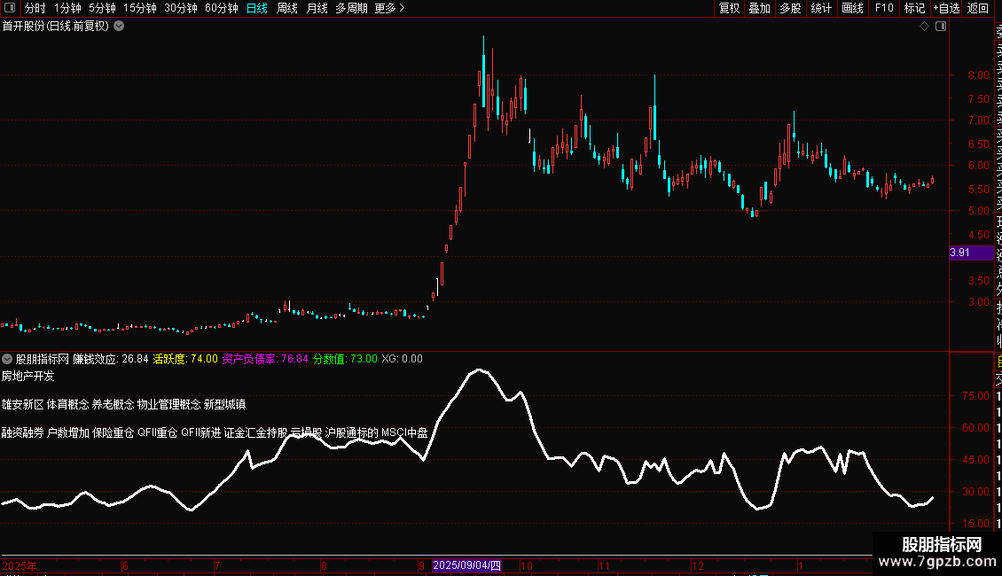 赚钱效应:IF(DLYZZ>38,DLYZZ,DLYZZ*1.3),LINETHICK3;