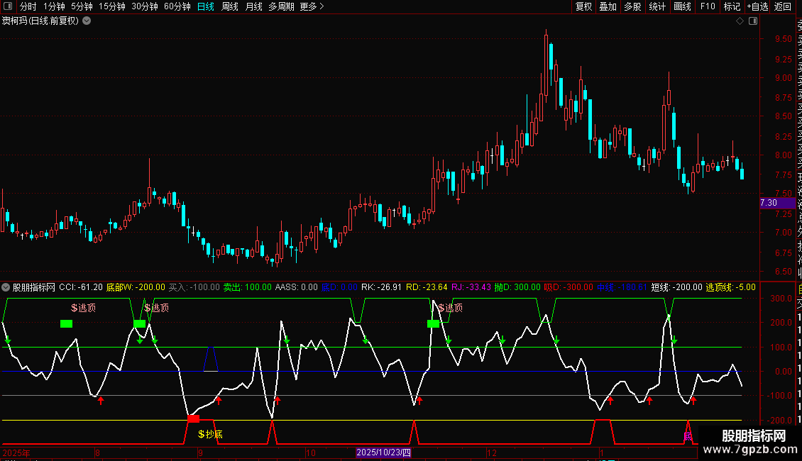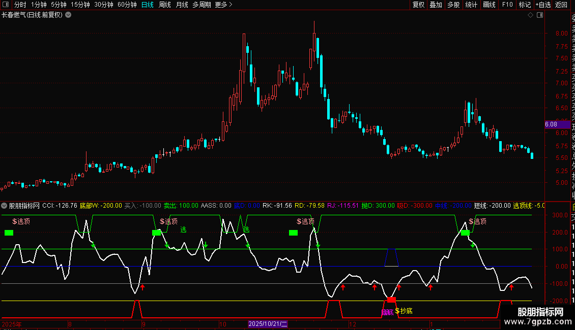 DRAWTEXT(中线>-3.5,逃顶线+220,'逃'),COLORGREEN;