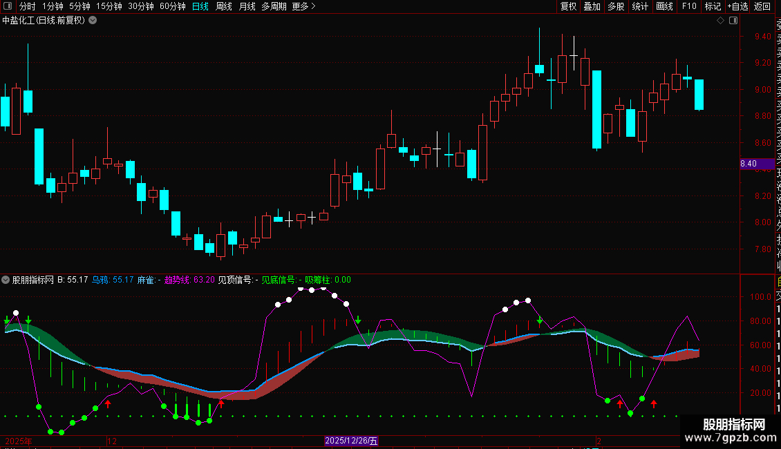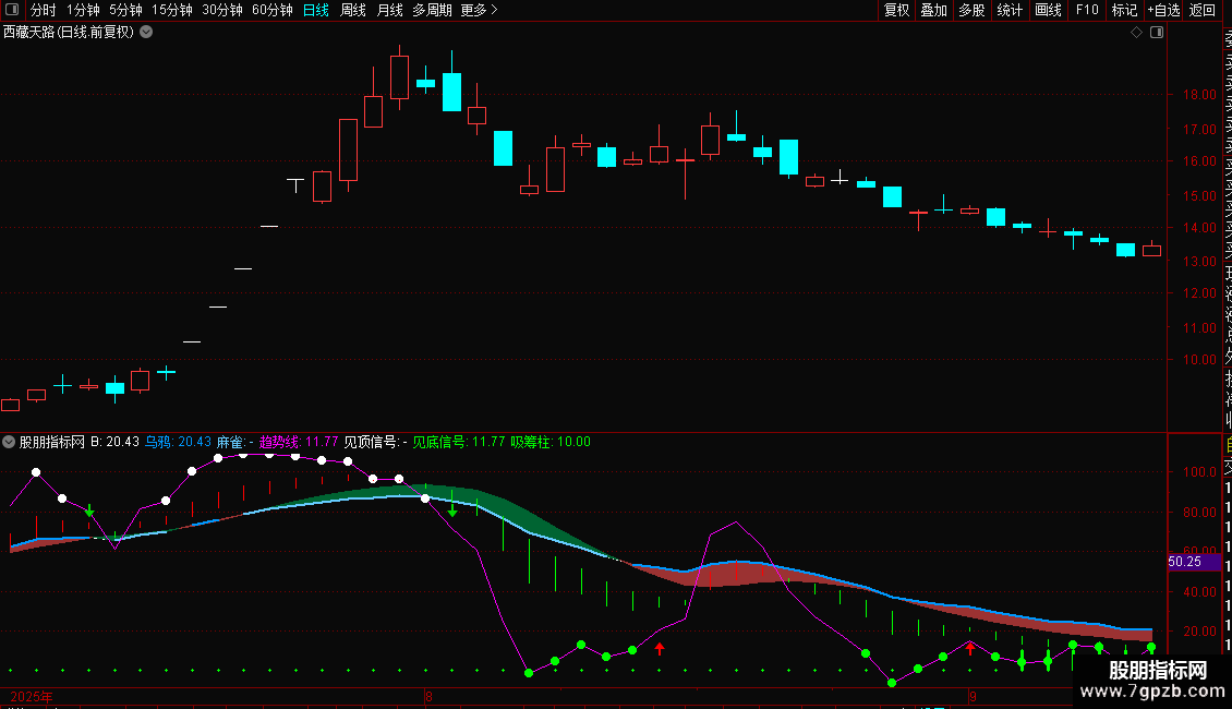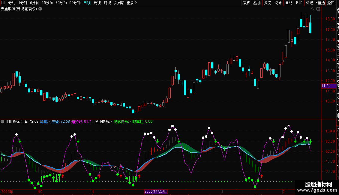 见底信号:IF(趋势线<=15,趋势线,DRAWNULL),CIRCLEDOT,COLOR00FF00,LINETHICK3;