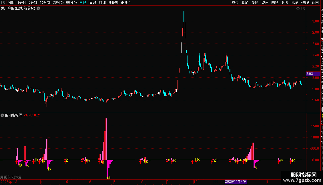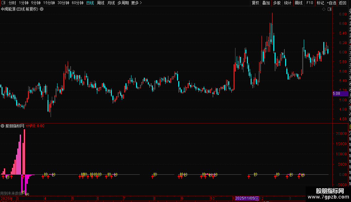 VAR7:=IF(VAR5<REF(VAR5,1),VAR5,0),COLORGREEN,NODRAW;