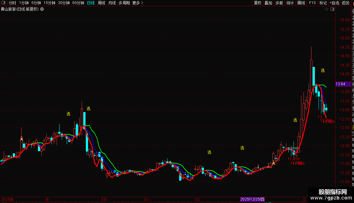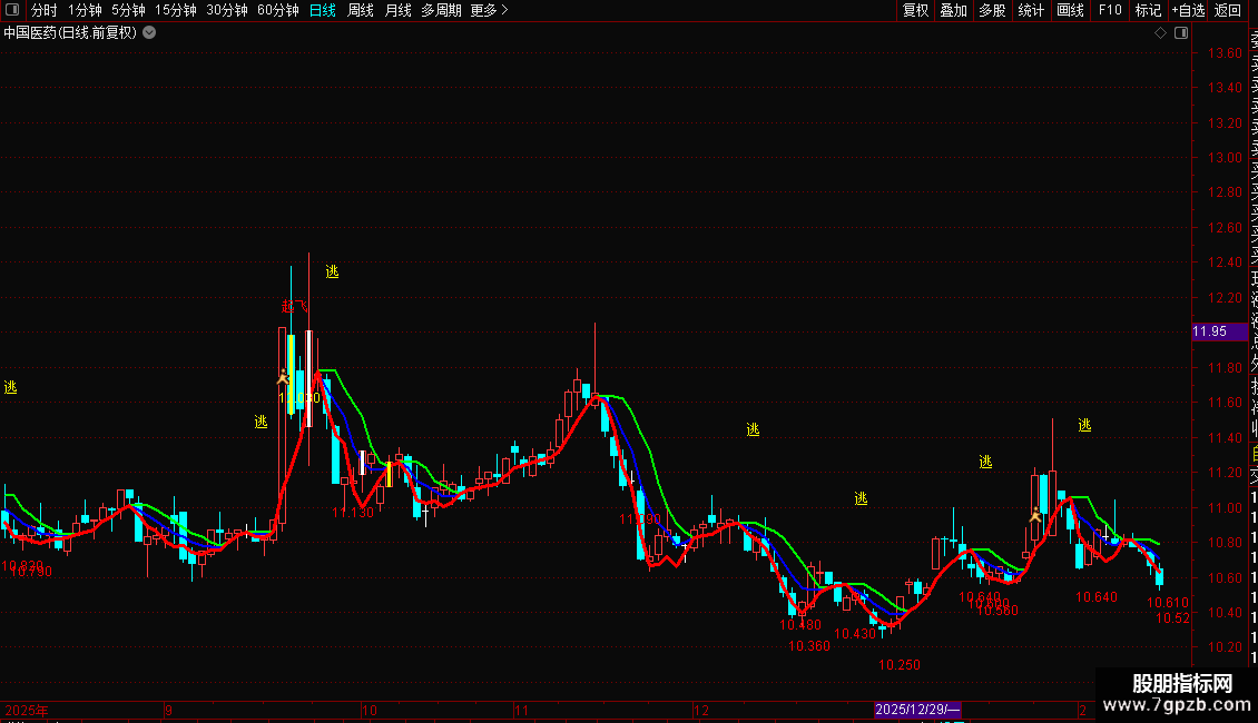 DRAWTEXT(COUNT(M3<M1 AND M3<M2 AND EVERY(L<MA(C,5),3) AND C<MA(C,5),2)>=1 AND COUNT(M3<M1 AND M3<M2 AND EVERY(L<MA(C,5),3) AND C<MA(C,5),2)<=1 AND C<MA(C,5) AND EVERY(C<MA(C,5),2) AND NOT(M3=M1 AND M3=M2),H*1.05,'逃')COLORYELLOW,LINETHICK3;