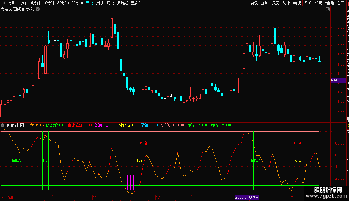 DRAWTEXT(CROSS(100,走势) AND C<生命线,50,'避险'),COLORGREEN;