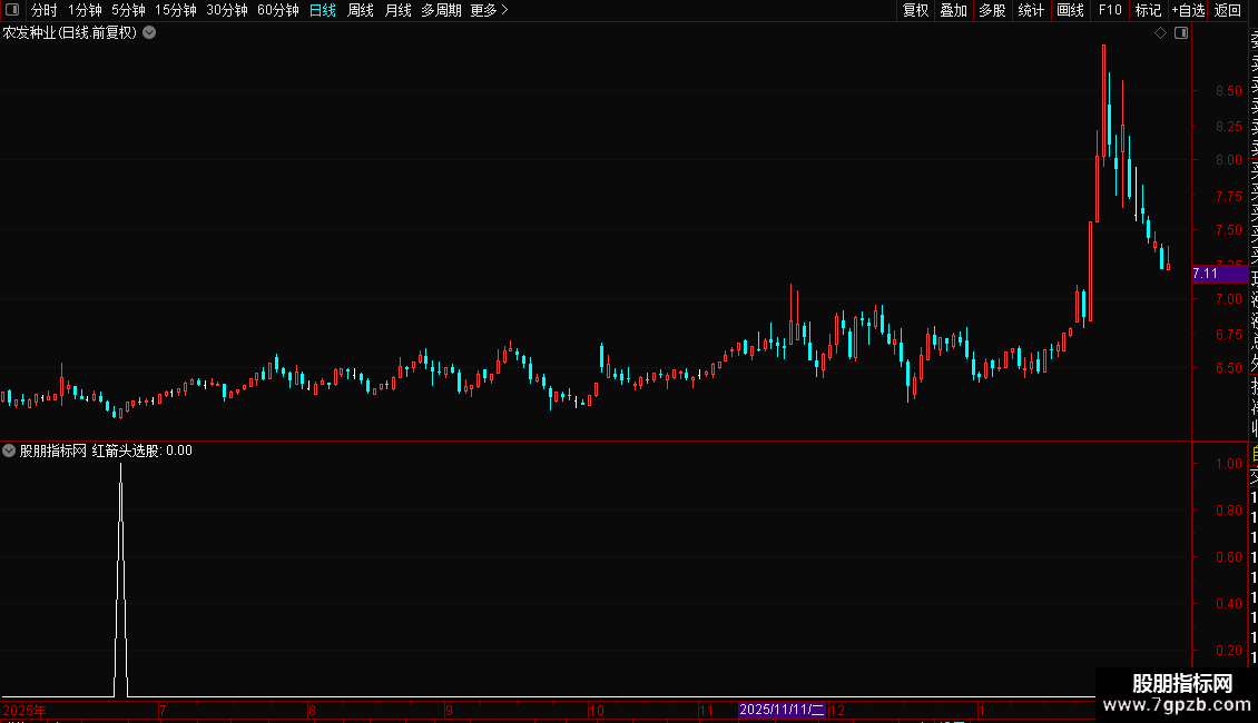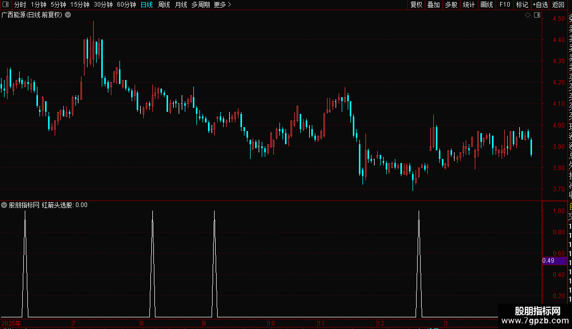 3. 红箭头选股:当“动力线”自下向上突破0.5(重点关注线)时,在K线图上标记买入信号箭头。