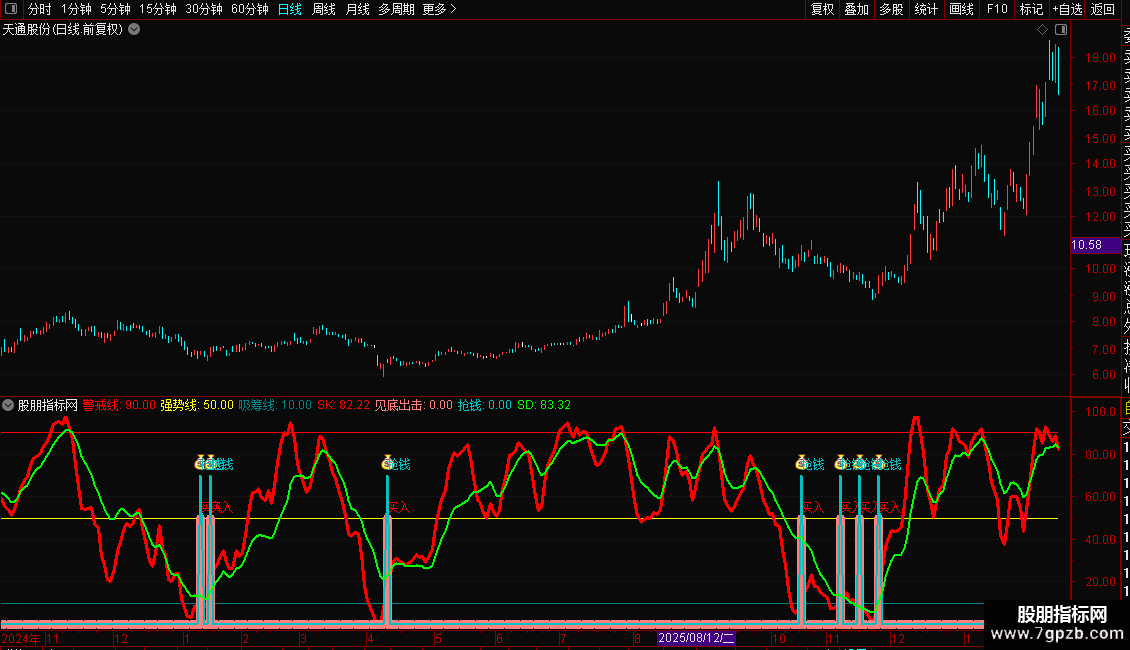 3. 当SK线从低位(通常≤10)向上突破时,会触发 “见底出击” 和 “抢钱” 信号,并标注“买入”或“抢钱”文字提示,预示可能的反弹买点。