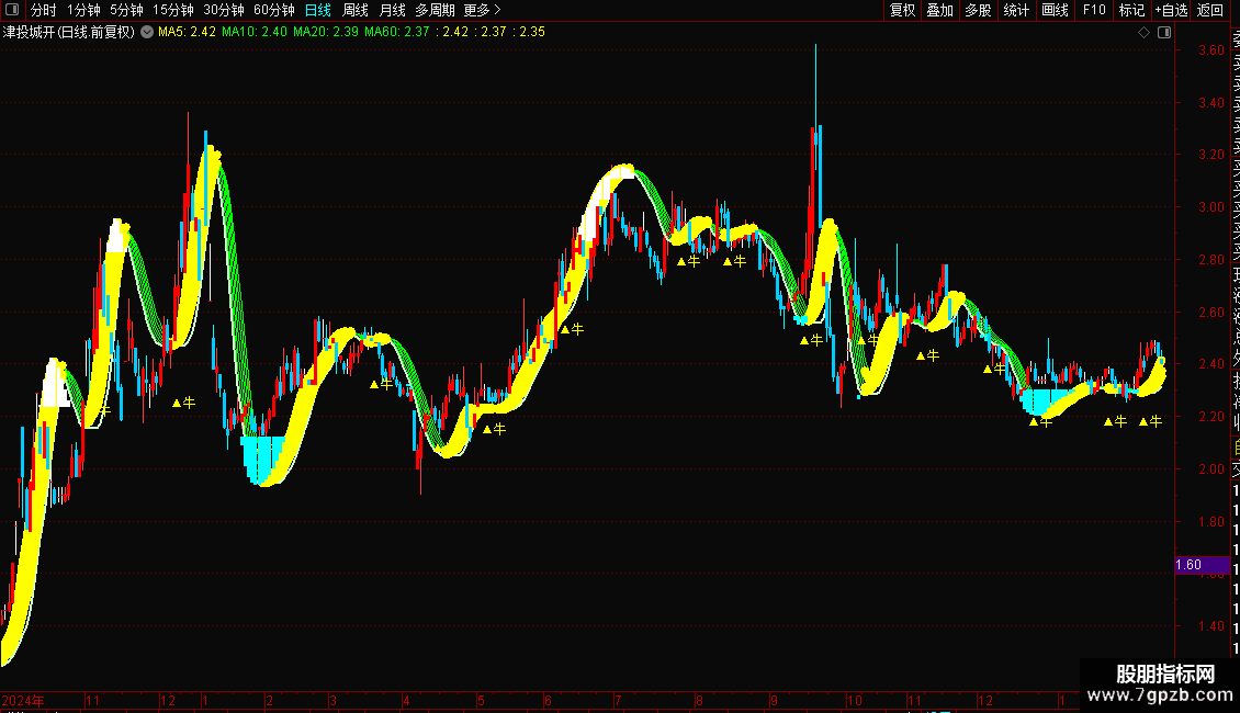 当短期均线EA上穿中期均线G3时,在K线下方标记“▲牛”作为买入提示。