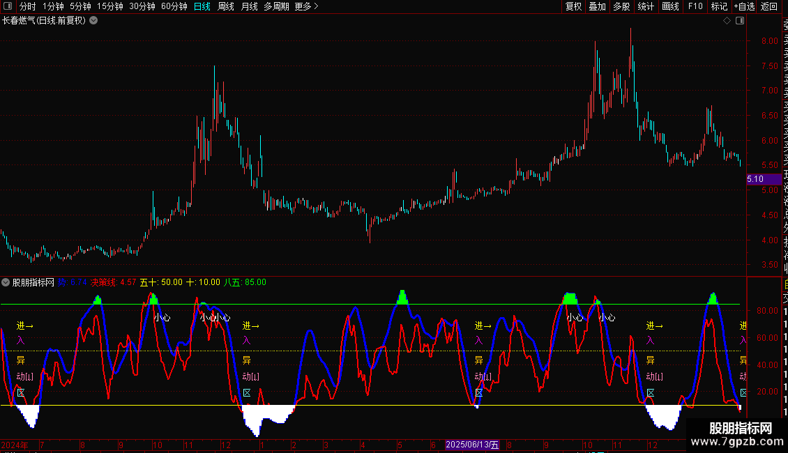 卖出/警示信号:当“决策线”自上而下穿越80时,会显示“小心”文字,提示可能进入高风险区域。
