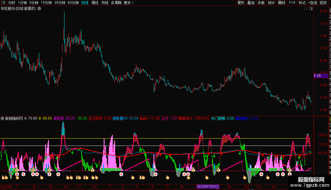 3、90以上的兰色和绿色柱是顶部提示,但出现兰色柱后,红色波段线在85以上,同时粘合k线持续上升,则可以持有,股价还有相当的上涨空间。