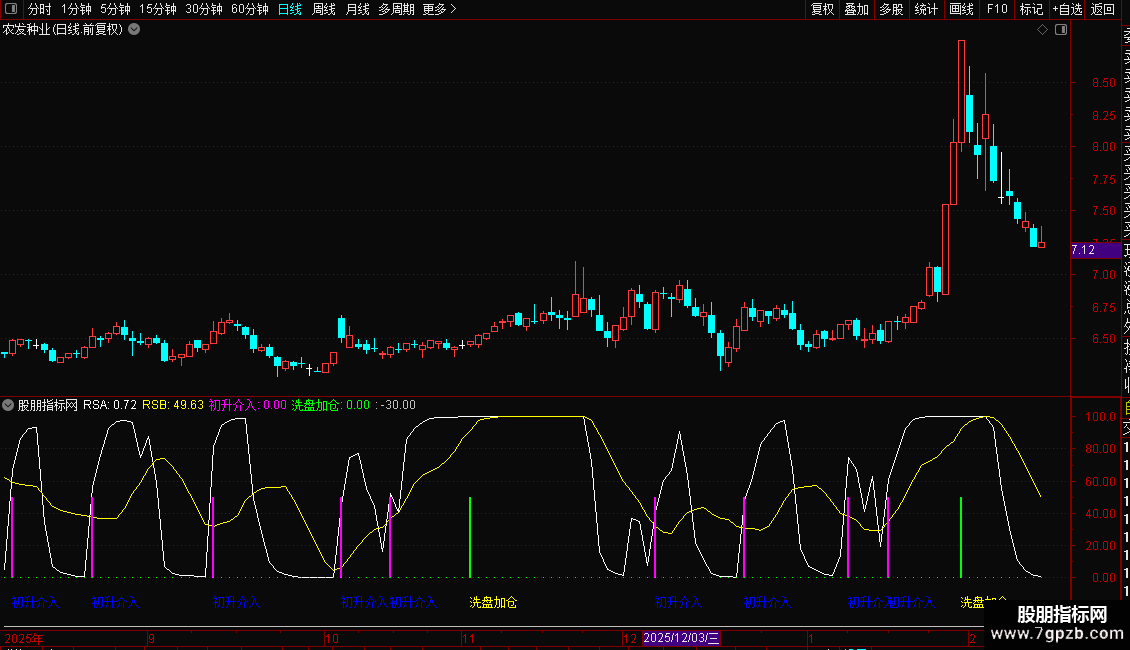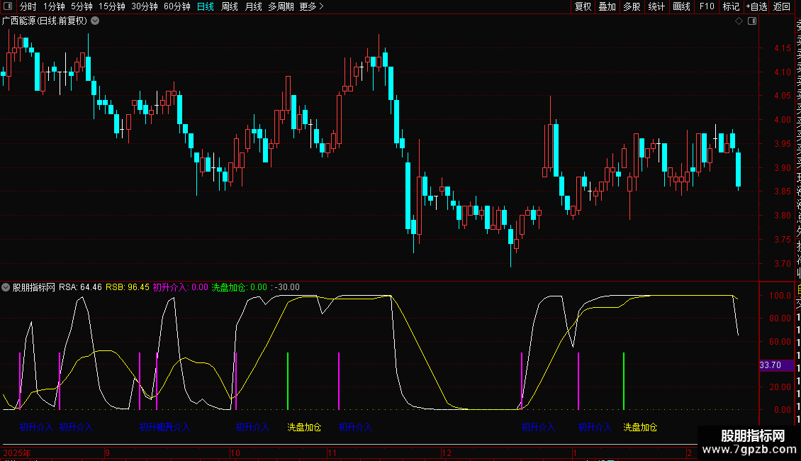 “初升介入”信号:当RSA上穿RSB时触发,提示可能的趋势启动点。