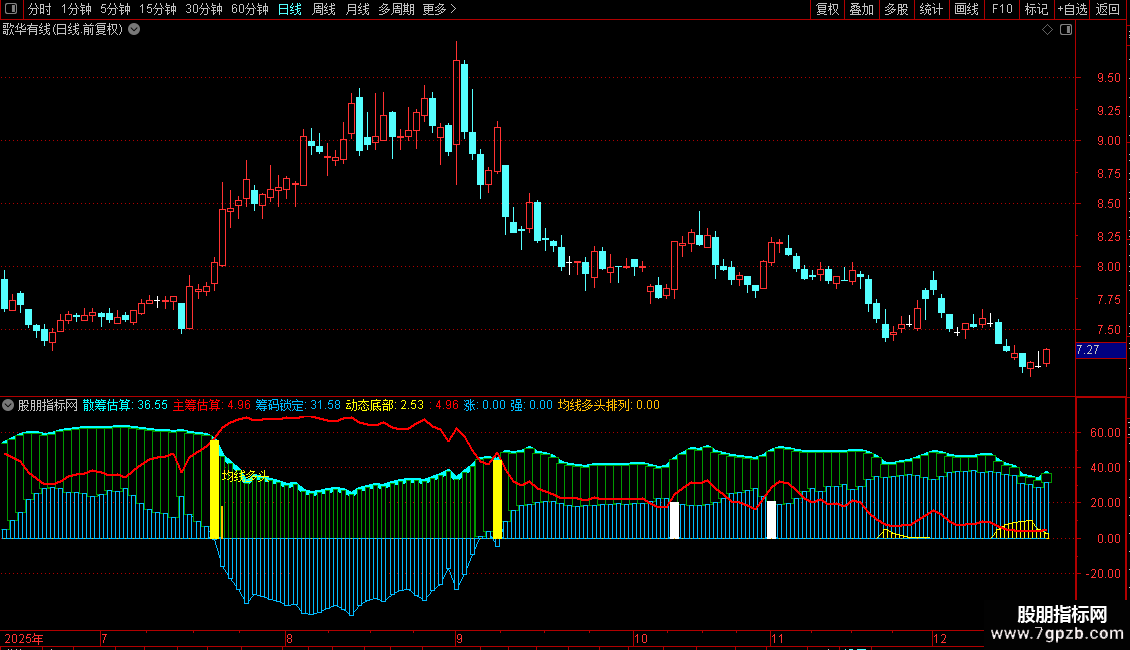 散筹估算:EMA((WINNER(C*1.1)-WINNER(C*0.9))*70,3),LINETHICK5,COLORFFFF00;