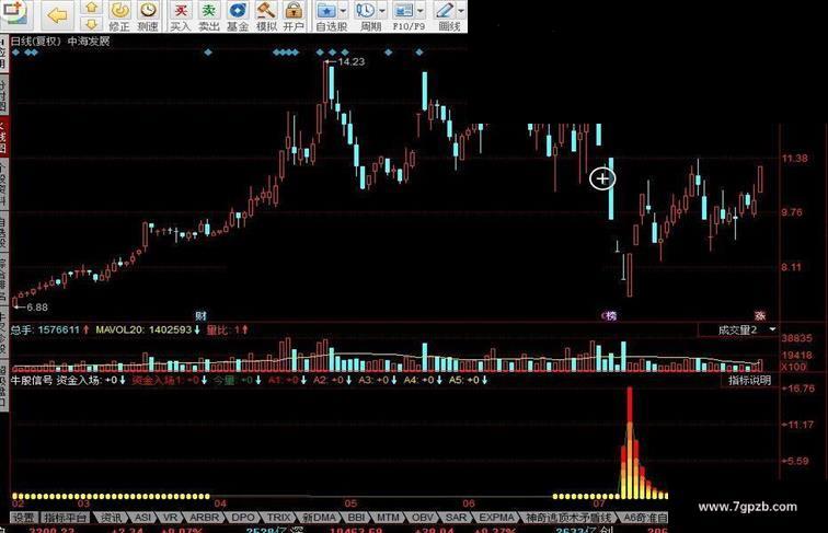 A2:IF(资金入场>0,今量*0.8,0),STICK,LINETHICK5, COLOR0066FF;