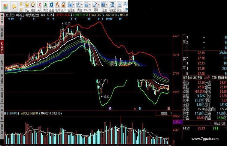 6.长期组从向上扩散状态匀速缓慢(2个小阴线)向下聚拢,短期组程扩散状态向下穿越长期组。可做空。