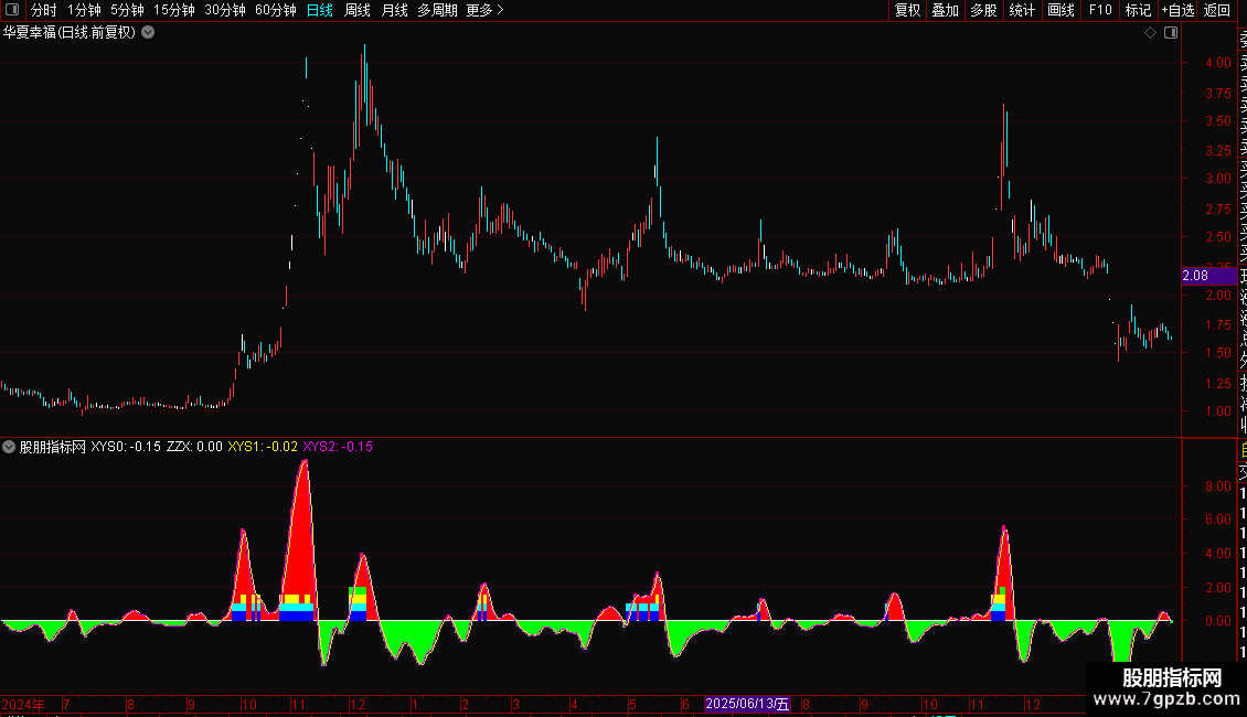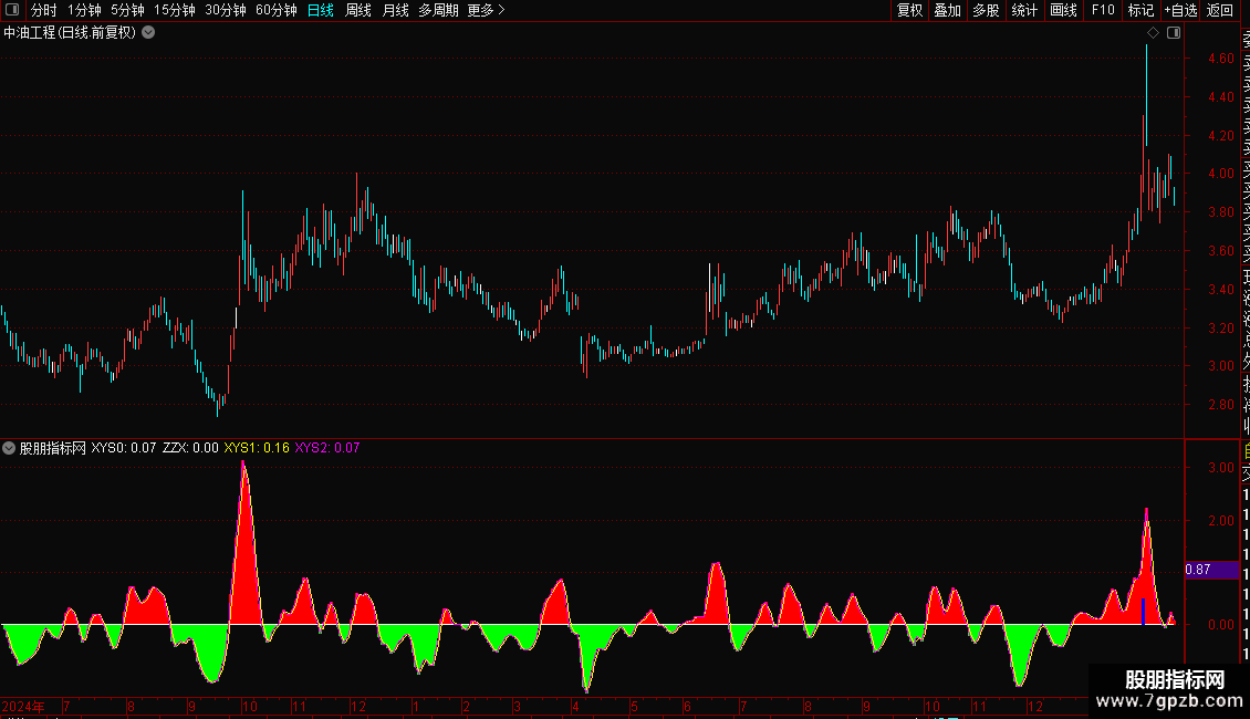 指标通过价格与成交量的多重平滑处理,生成两条核心曲线和一组柱状信号。主图显示价格变化率及其均线,副图通过量价关系识别特定强度区间。柱状图直观区分涨跌强度,辅助判断短期动能。