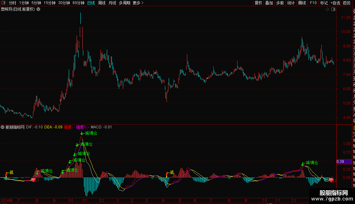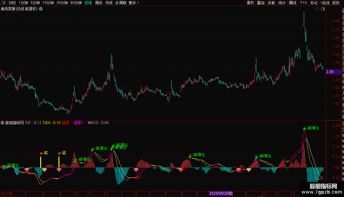 指标在MACD常规图表上叠加了多种信号标记(图标、文字、色柱)。