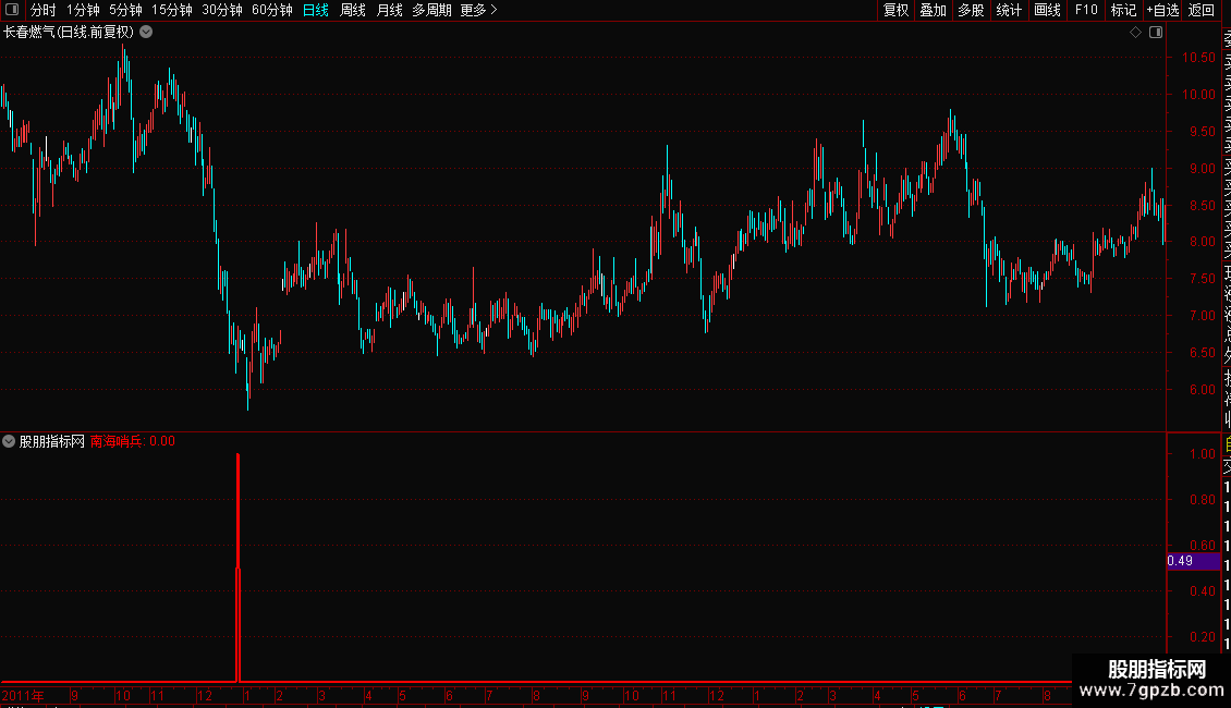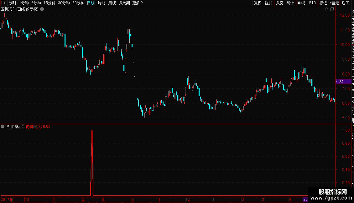 当以上三个条件(短期动能金叉、价格深度超跌、区间位置金叉且低位)同时满足时,指标会在副图或主图上以粗红线标记“南海哨兵”信号点,提示关注可能的买入机会。